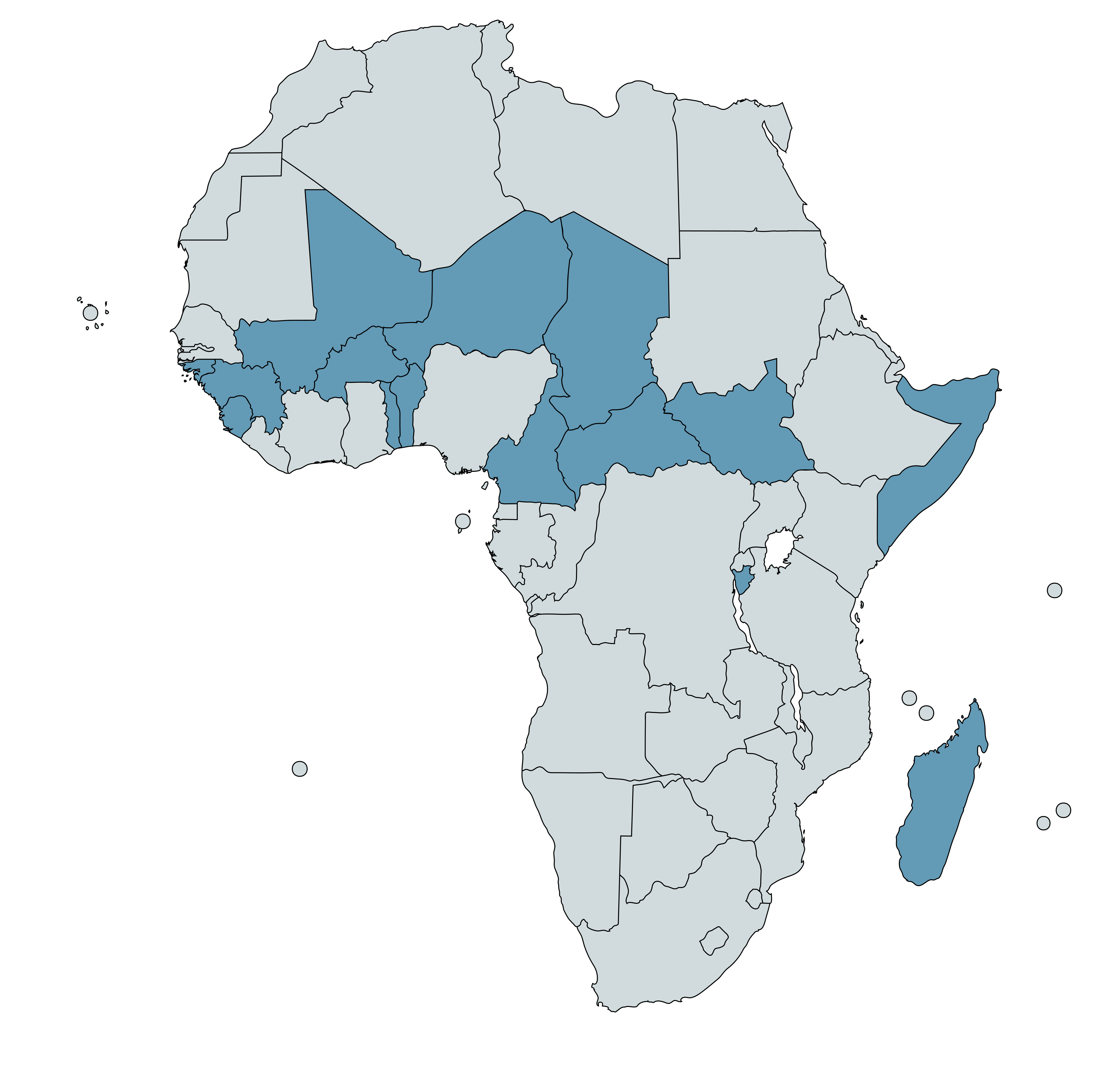 Chad, Niger, Central African Republic, Mali, Burkina Faso, South Sudan, Somalia, Togo, Burundi, Guinea, Sierra Leone, Cameroon, Madagascar, Guinea-Bissau, and Benin. See list here.